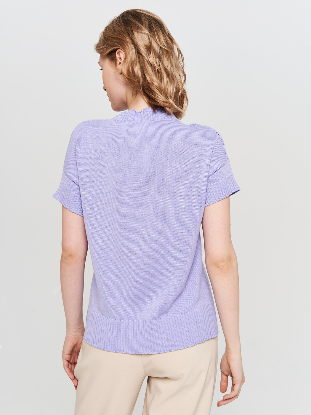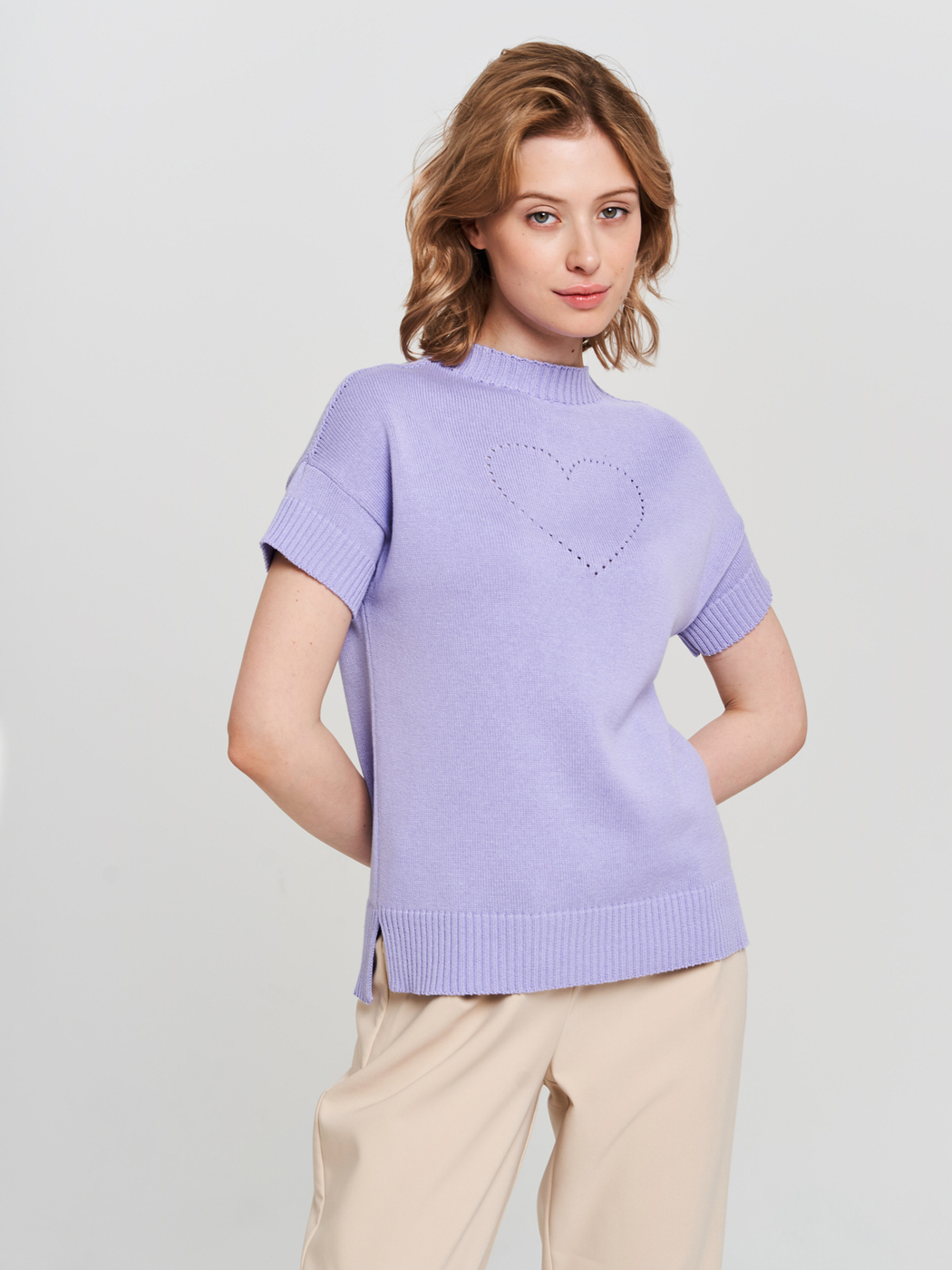 Джемпер свободного силуэта со спущенными короткими рукавами, разрезами по бокам и цельновязаным воротником. Декоративное сердечко, вывязанное небольшими дырочками, придаёт модели «изюминку» и делает её ещё более привлекательной. Изделие связано из высококачественного немецкого полухлопка. Очень удобная модель, в которой есть всё, чтобы чувствовать себя удобно, красиво и индивидуально!