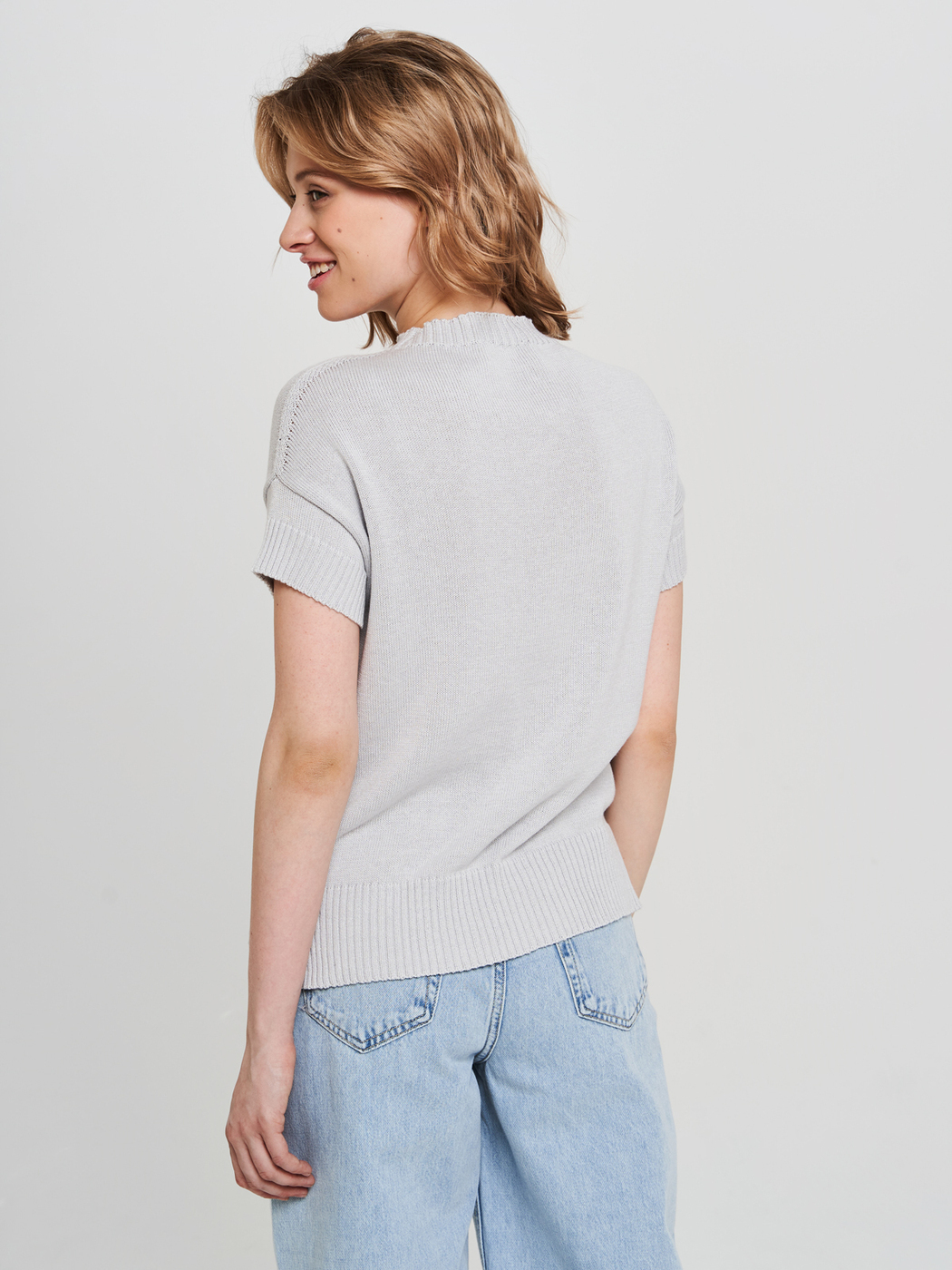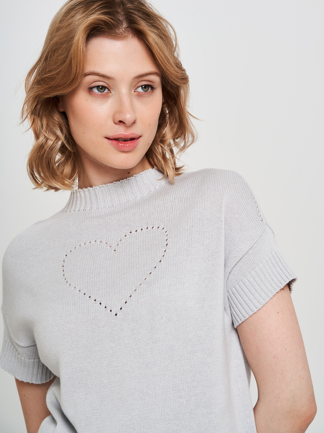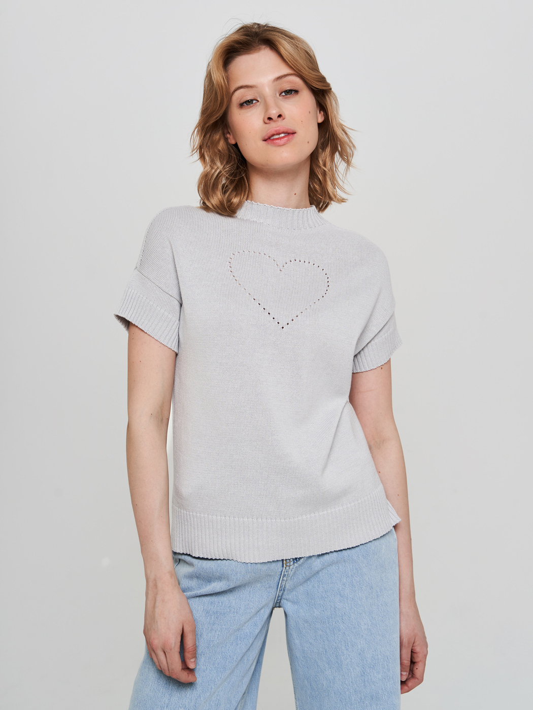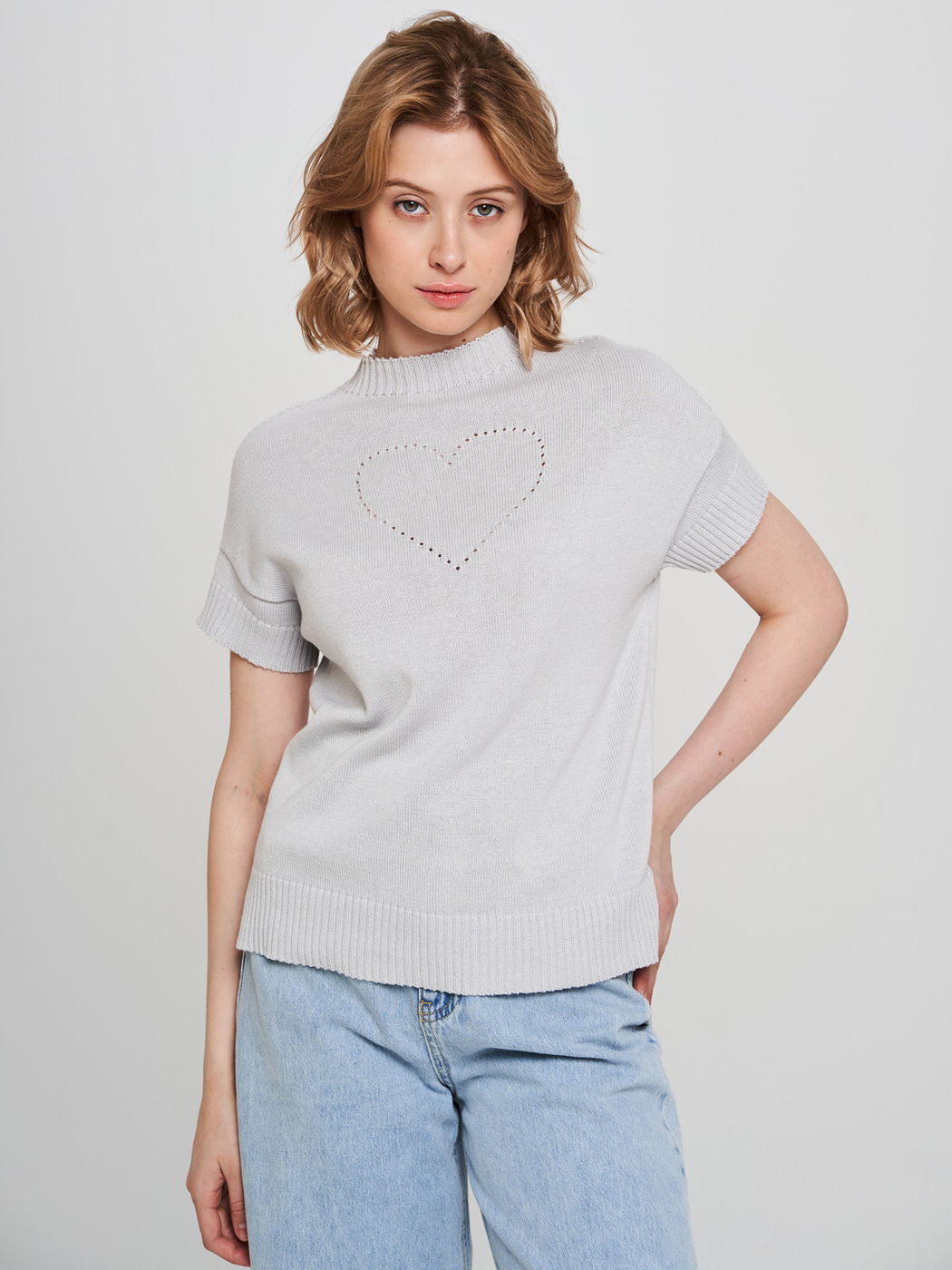 Джемпер свободного силуэта со спущенными короткими рукавами, разрезами по бокам и цельновязаным воротником. Декоративное сердечко, вывязанное небольшими дырочками, придаёт модели «изюминку» и делает её ещё более привлекательной. Изделие связано из высококачественного немецкого полухлопка. Очень удобная модель, в которой есть всё, чтобы чувствовать себя удобно, красиво и индивидуально!