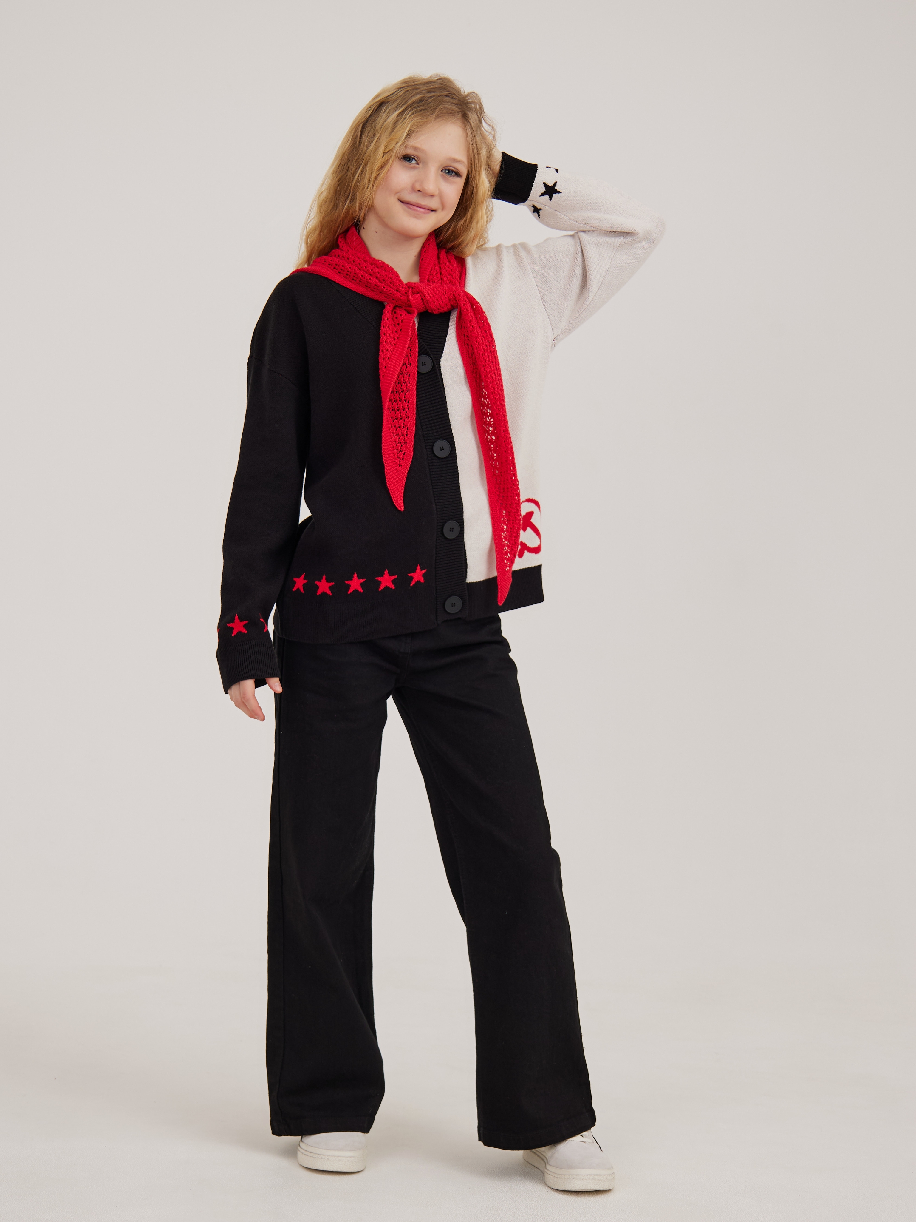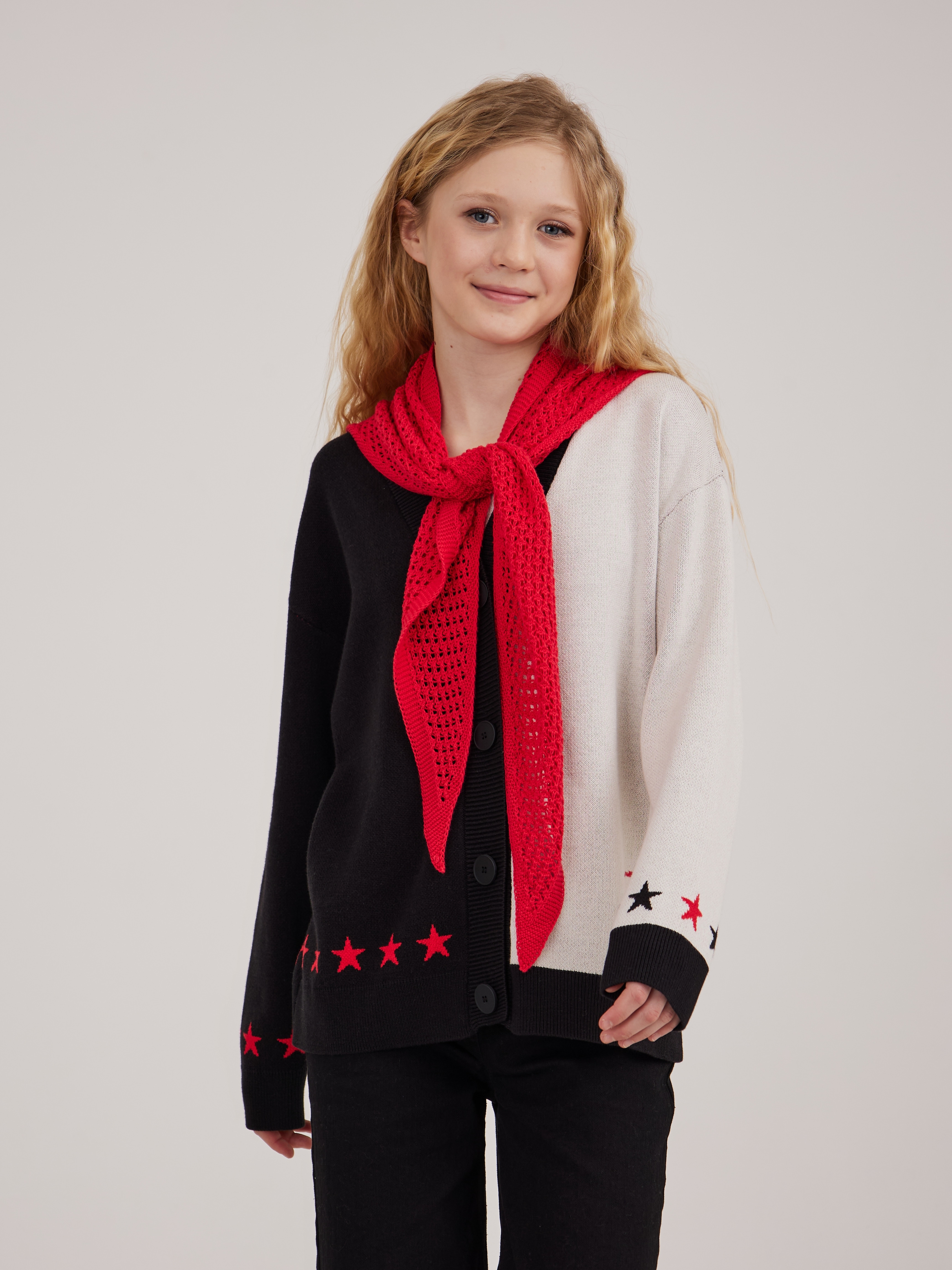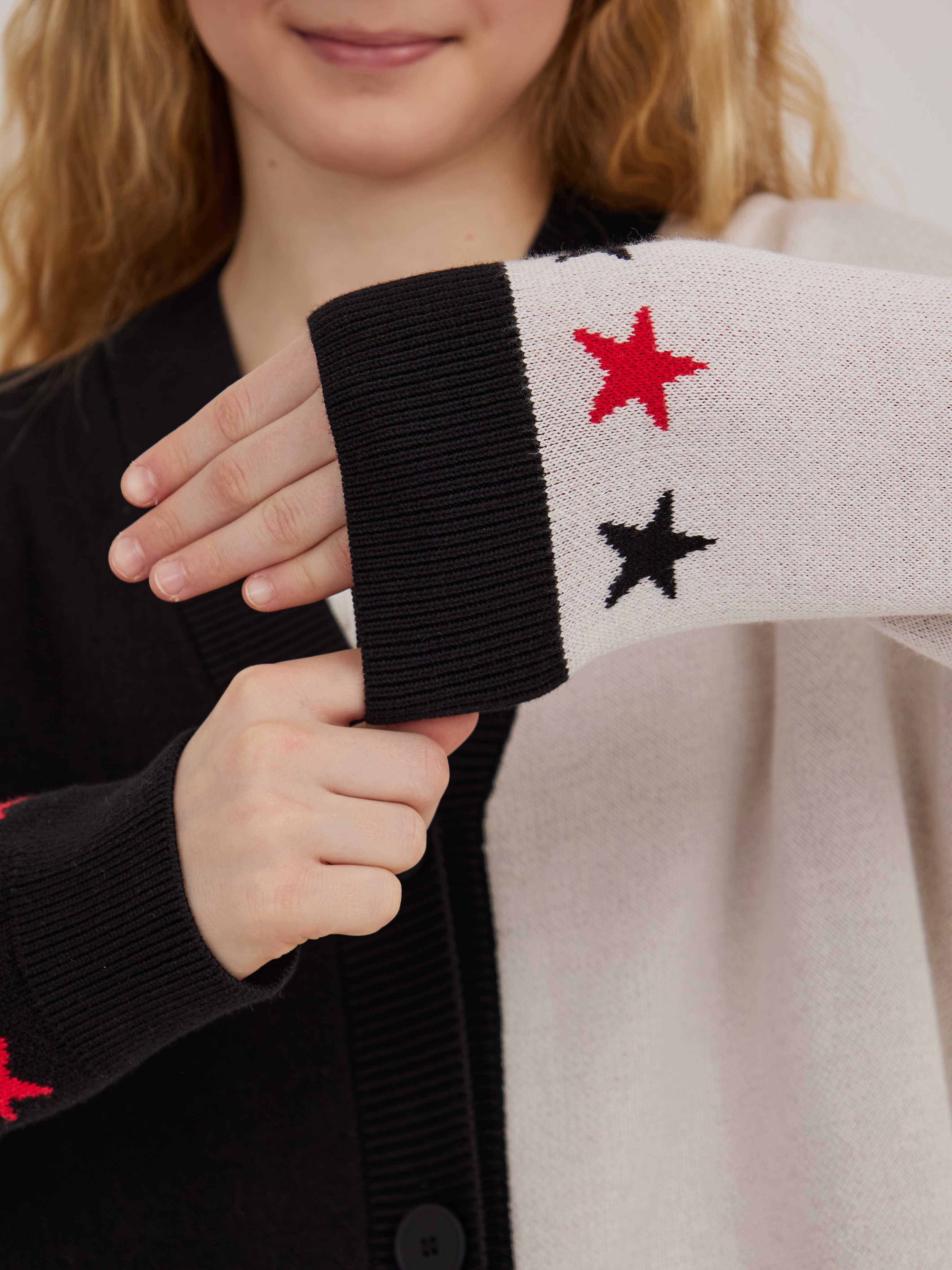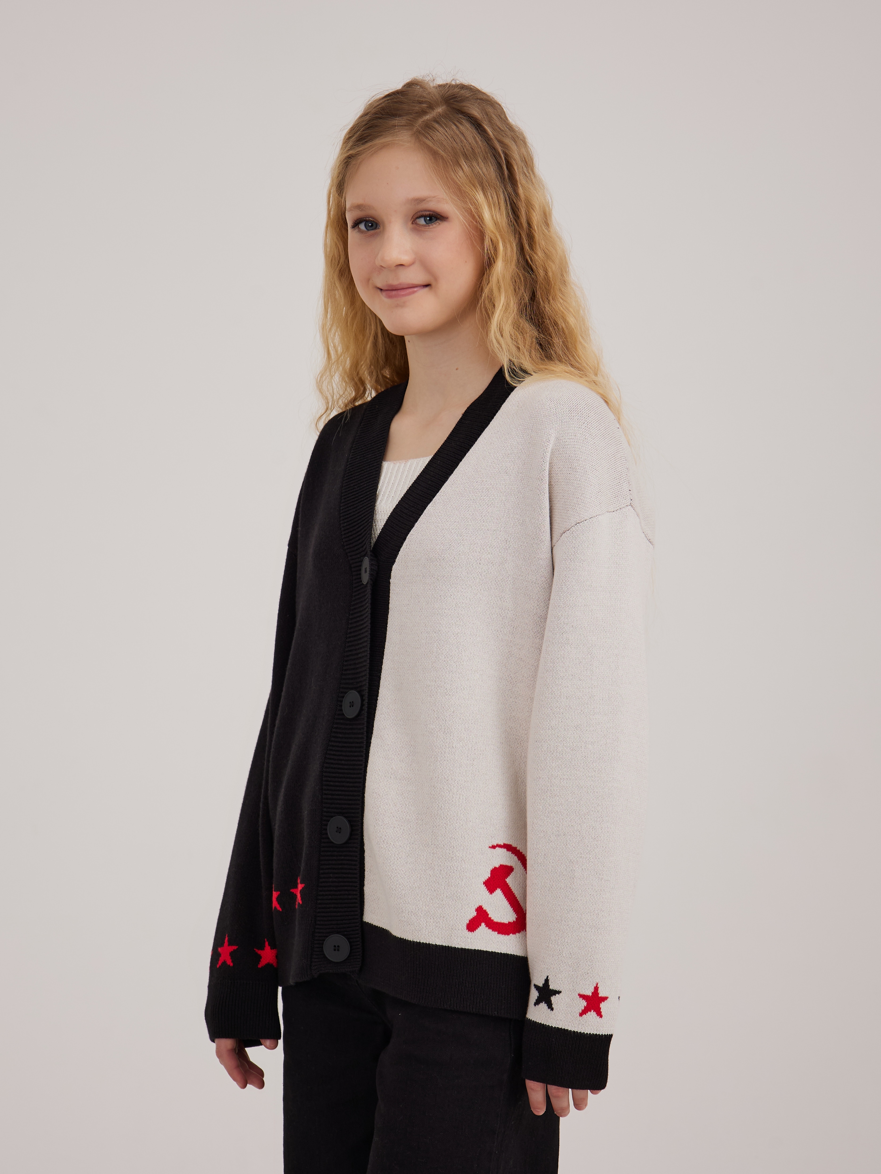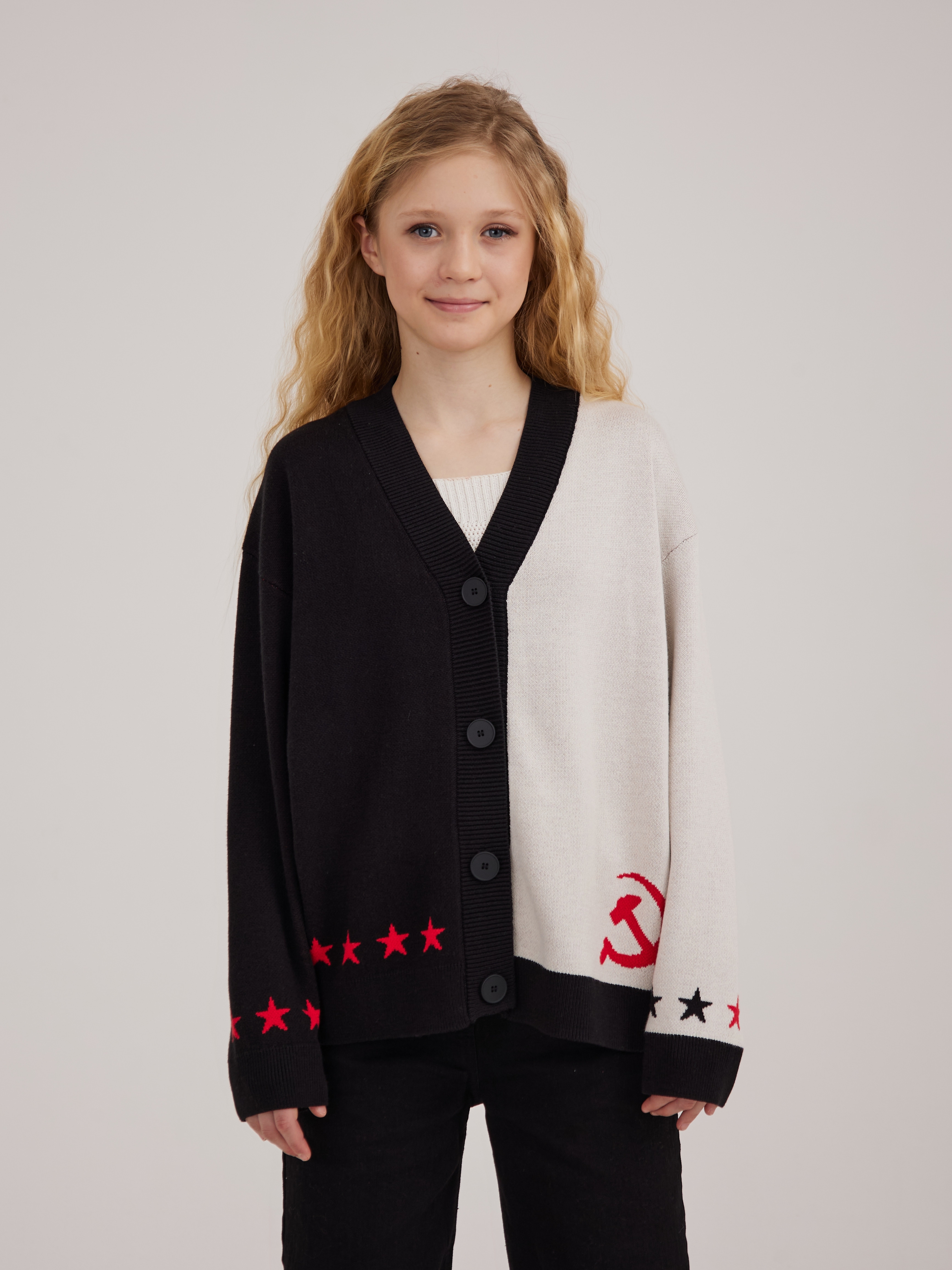 Передняя часть кардигана более сдержанная: геометрическое деление цвета, лаконичные детали и аккуратный акцент в виде символики создают баланс между выразительностью и повседневностью.