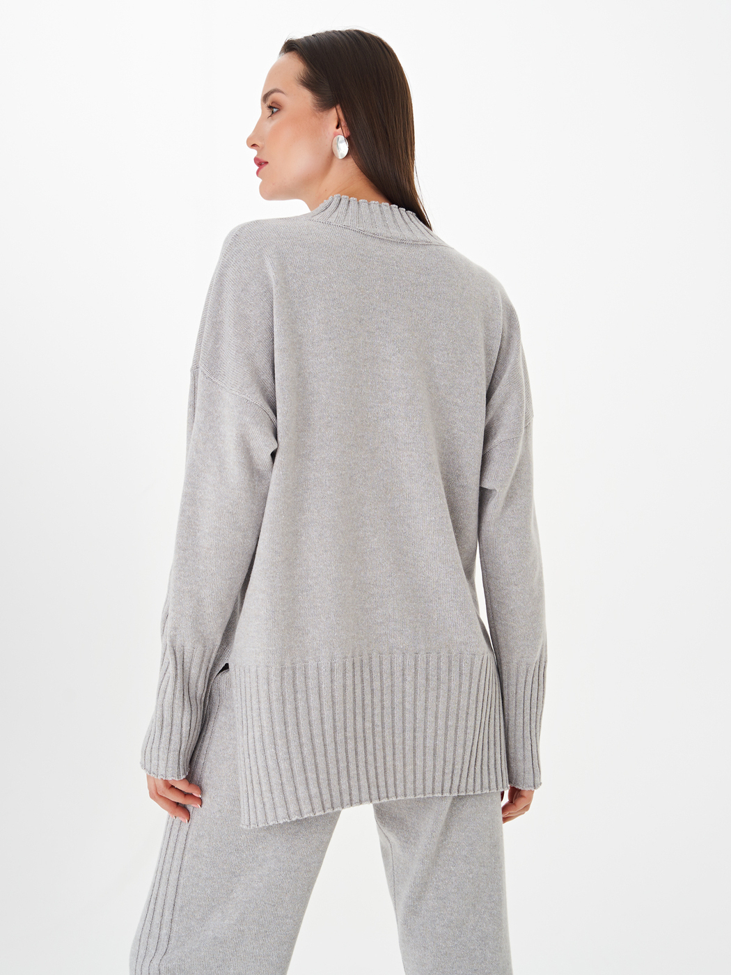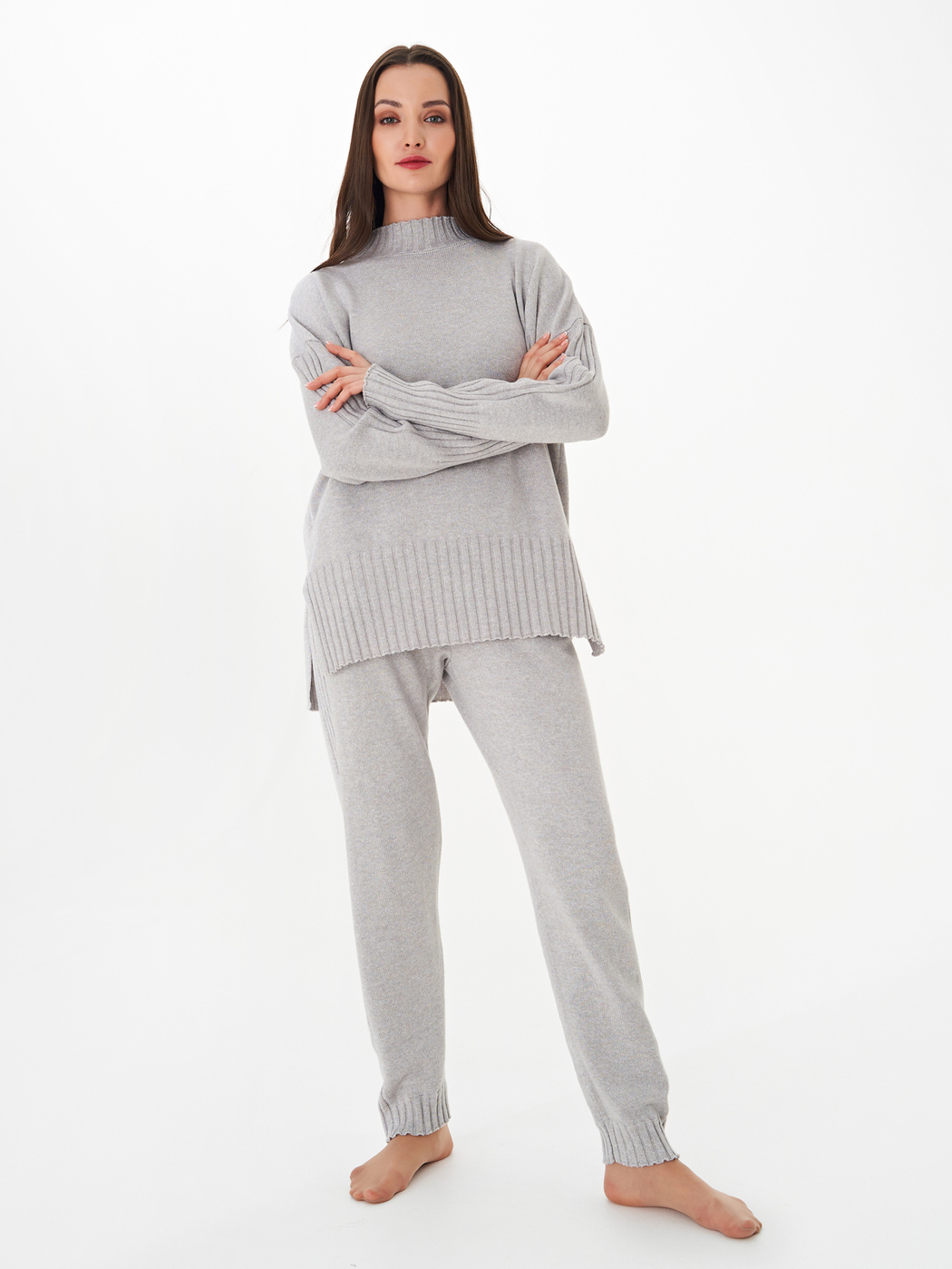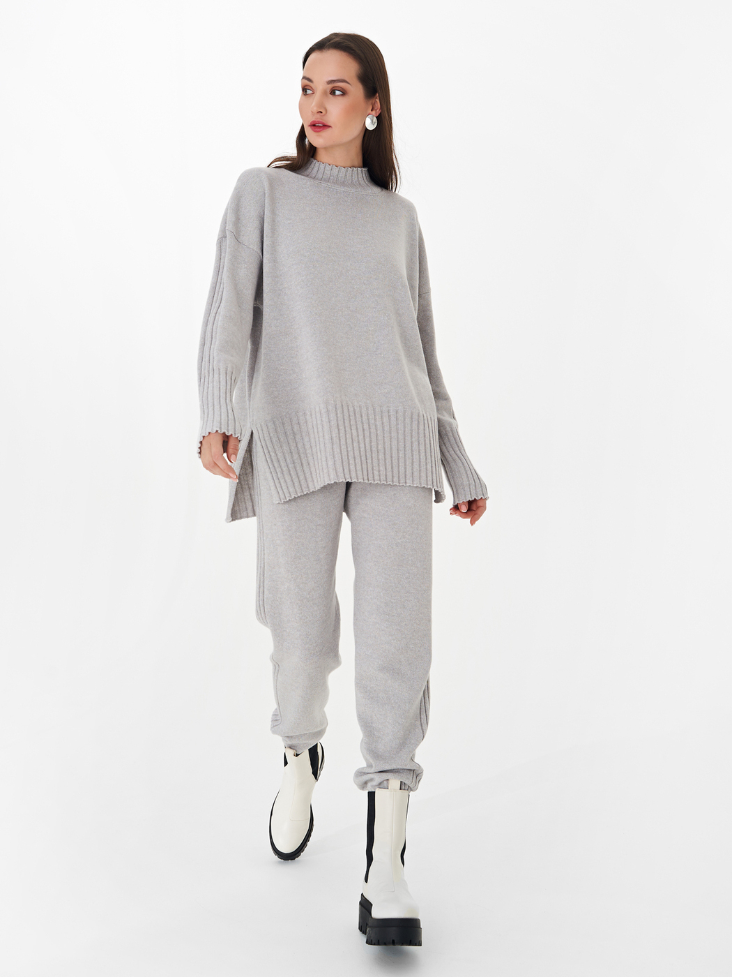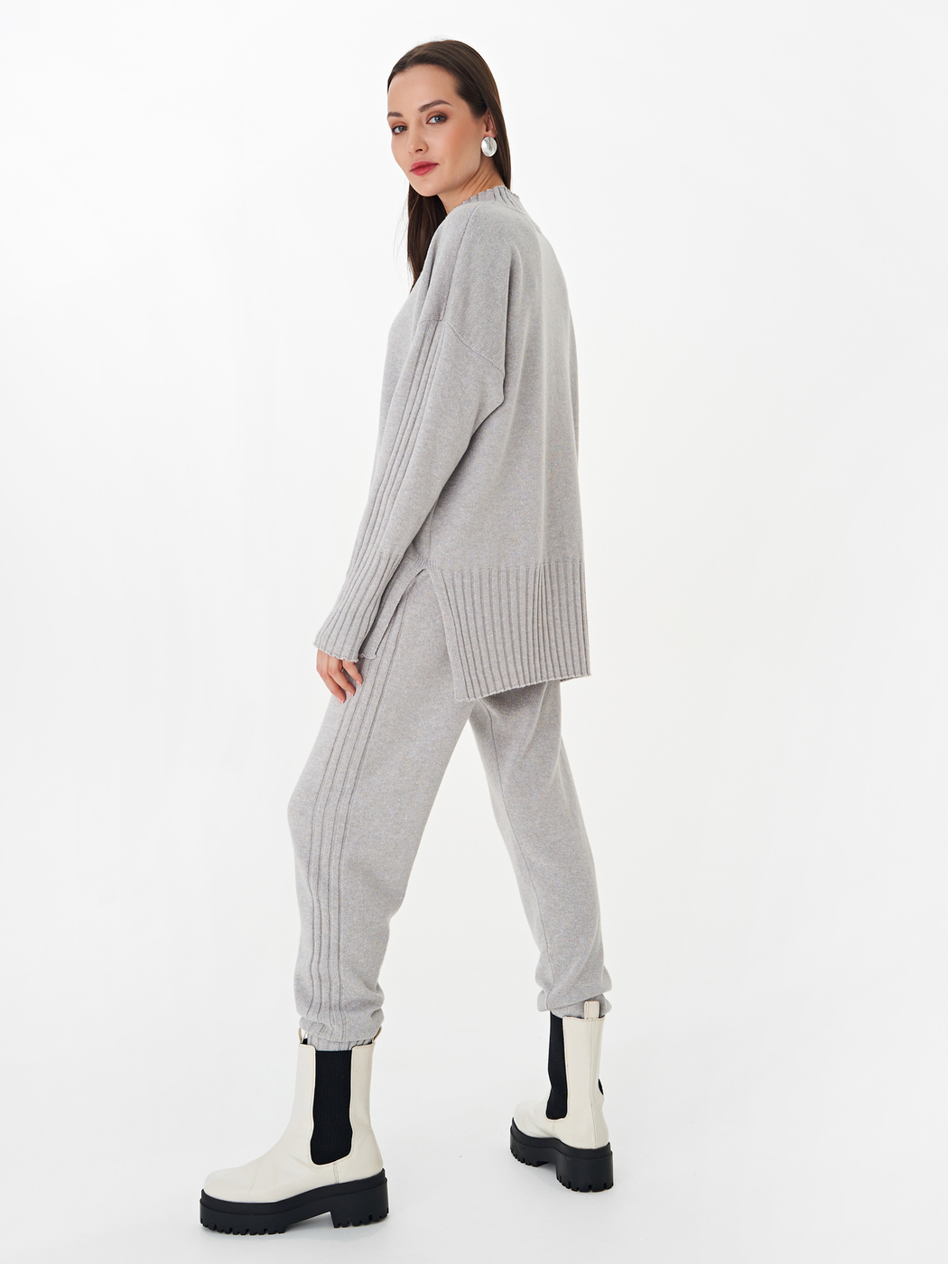 Костюм женский брючный. Выполнен в спортивном стиле с лампасами по бокам брюк и центру рукава. Джемпер свободного силуэта со спущенными рукавами, разрезами по бокам и воротником полустойка. Брюки с карманами в боковых швах, слегка заужены к низу. Невероятно удобная и привлекательная модель, в которой есть всё, чтобы чувствовать себя удобно и красиво!