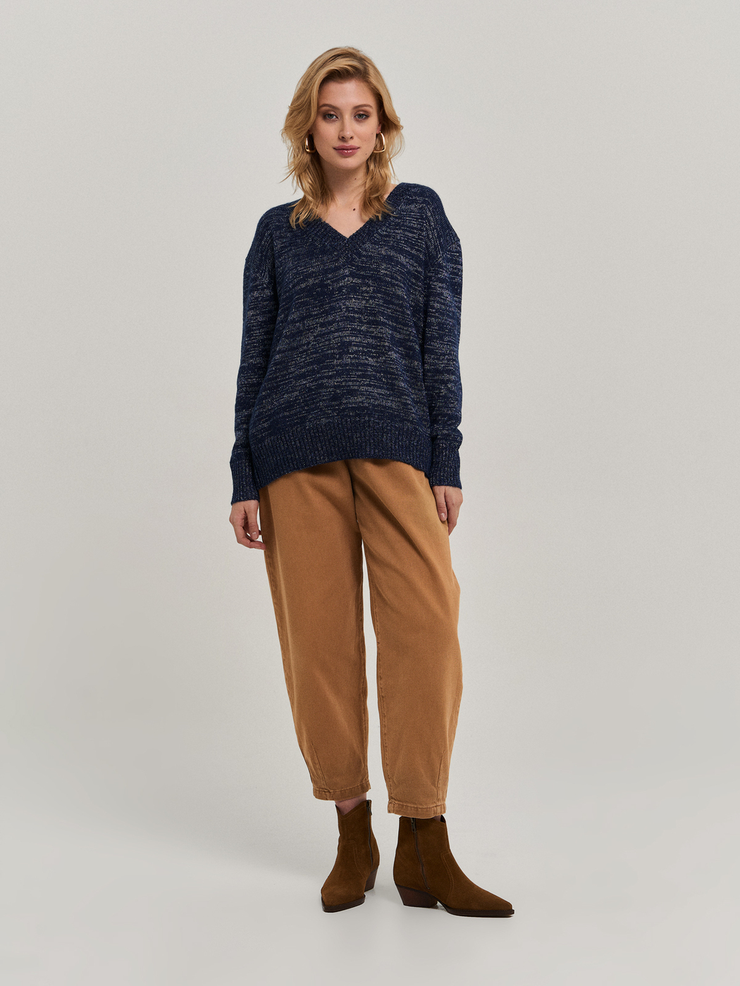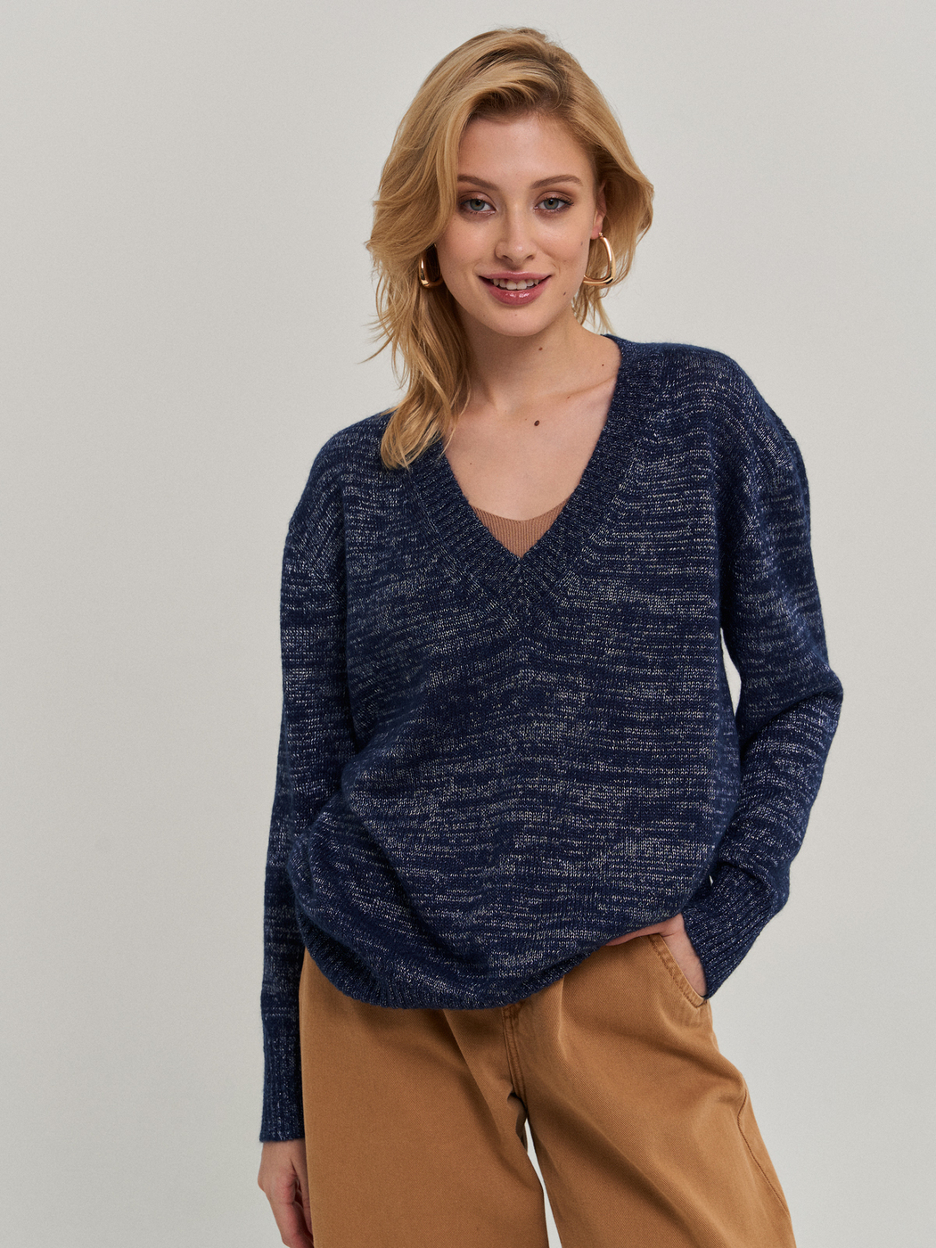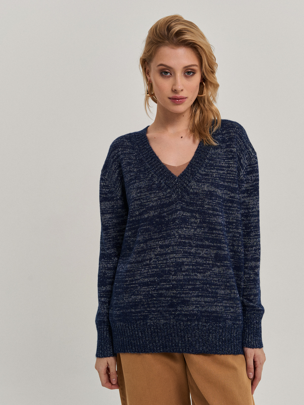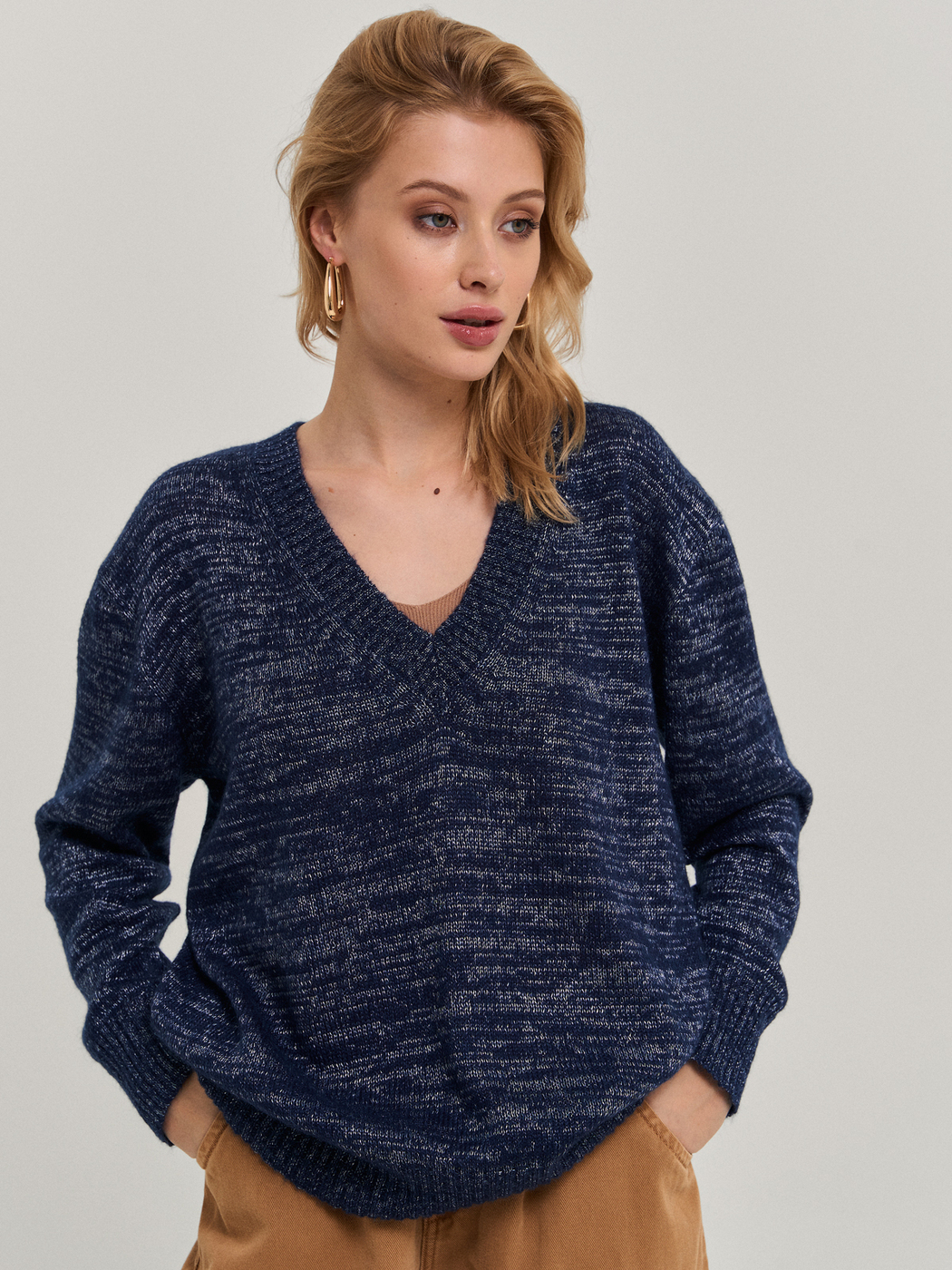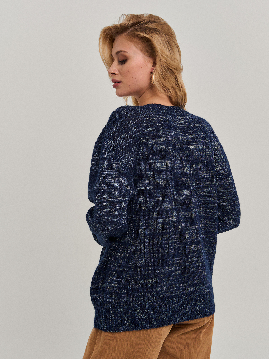 Пуловер свободного силуэта с глубоким вырезом, рукав со спущенной проймой. Выполнен по технологии Fully fashioned (каждая из деталей вывязываются отдельно и соединяются на специальной машине).Модель связана из фасонной итальянской пряжи - мохер в сочетании с нитью благородного блеска, дают очень интересный эффект. Модель прекрасно сочетается как с джинсами, так и с классическими брюками и юбками. Наденьте её на голое тело, с топом или с сорочкой - Вы всегда будете выглядеть великолепно! Пряжа не пиллингуется, после стирки не деформируется.