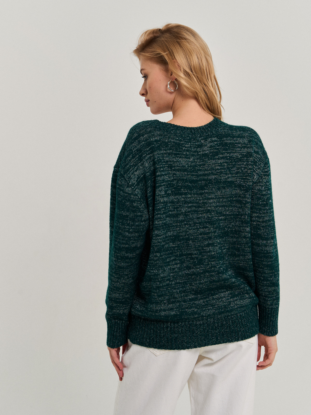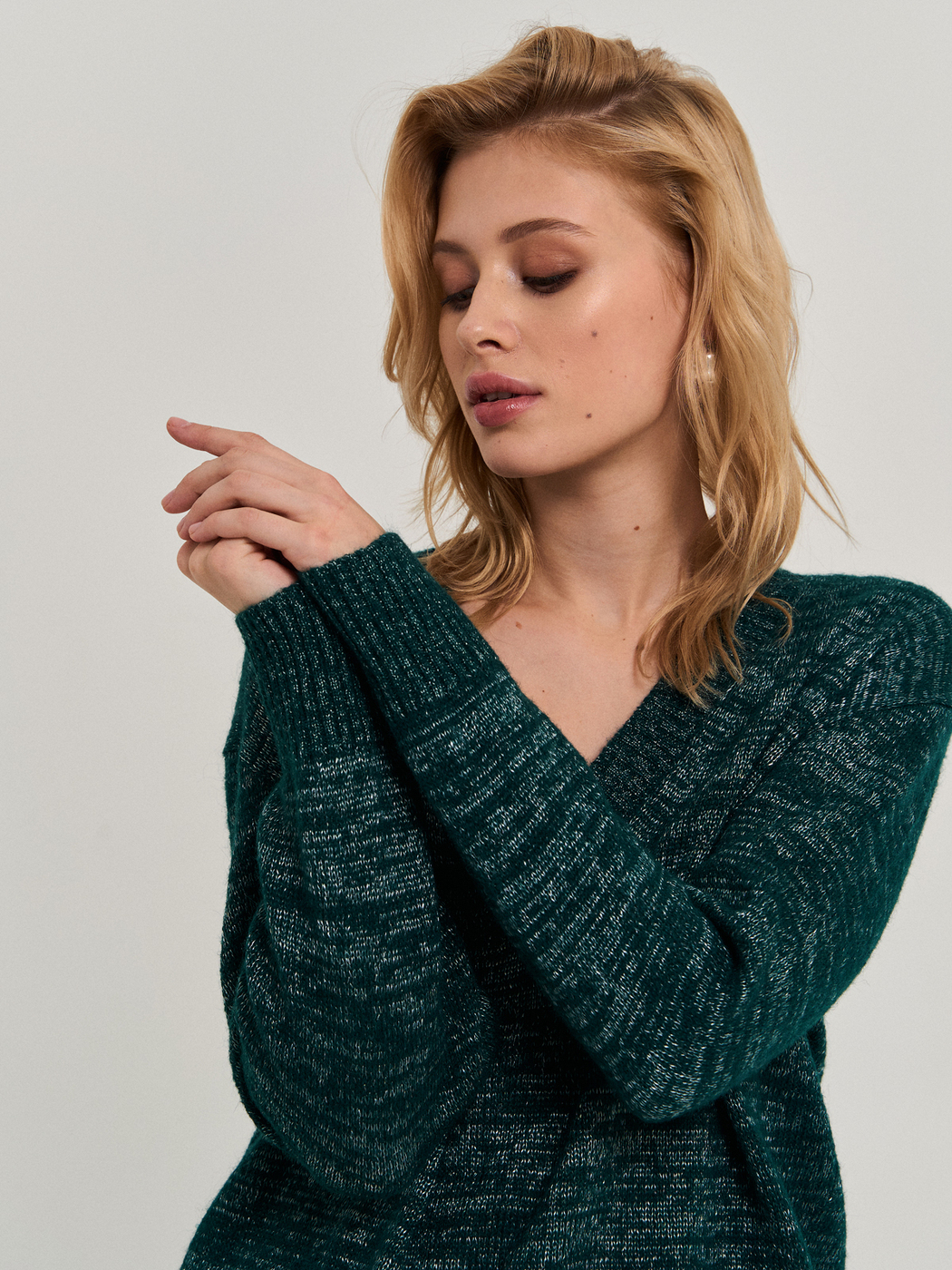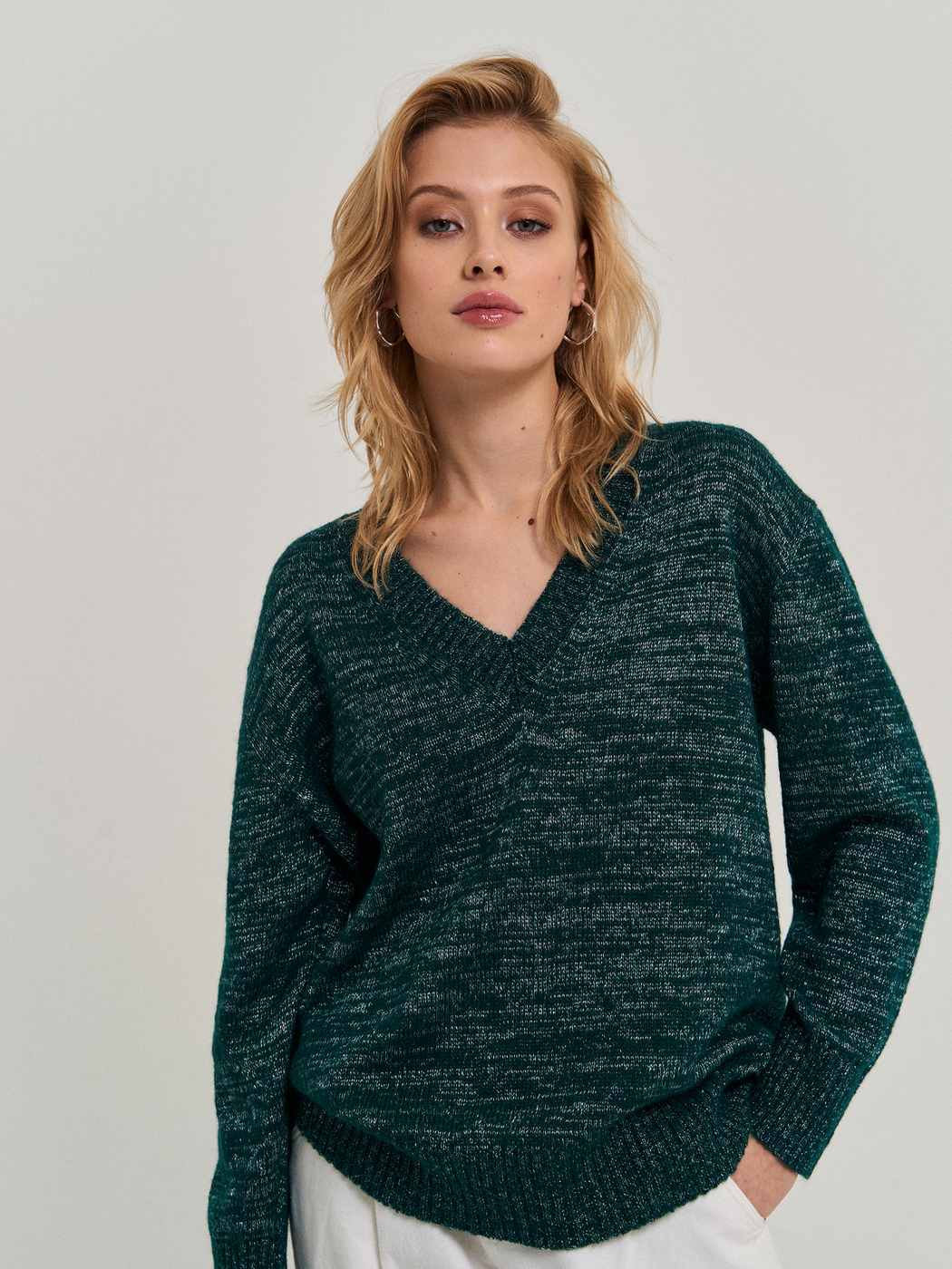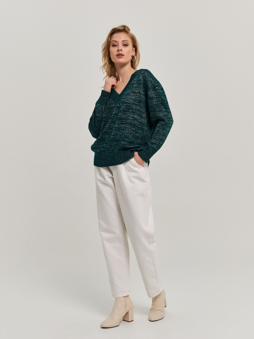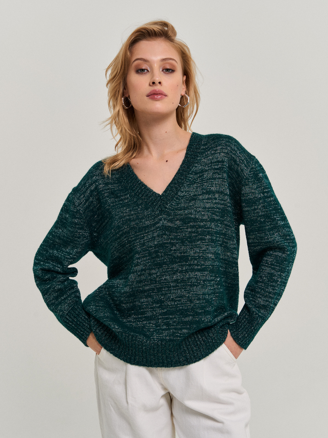 Пуловер свободного силуэта с глубоким вырезом, рукав со спущенной проймой. Выполнен по технологии Fully fashioned (каждая из деталей вывязываются отдельно и соединяются на специальной машине).Модель связана из фасонной итальянской пряжи - мохер в сочетании с нитью благородного блеска, дают очень интересный эффект. Модель прекрасно сочетается как с джинсами, так и с классическими брюками и юбками. Наденьте её на голое тело, с топом или с сорочкой - Вы всегда будете выглядеть великолепно! Пряжа не пиллингуется, после стирки не деформируется.